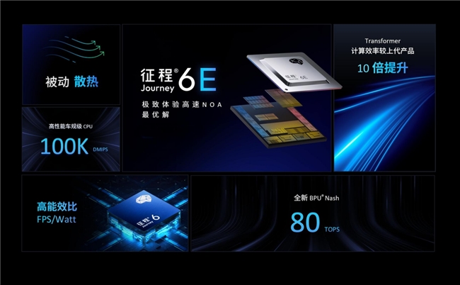 征程6E堪称高速NOA计算方案*优解,搭载地平线自研的专用智驾计算架构BPU纳什,具备80TOPS算力,内置高性能车规级CPU,可提供100KDMIPS算力,并集成全功能MCU,以超高集成度实现更低的功耗和更优的系统成本,拥有强大兼容性与量产成熟度。